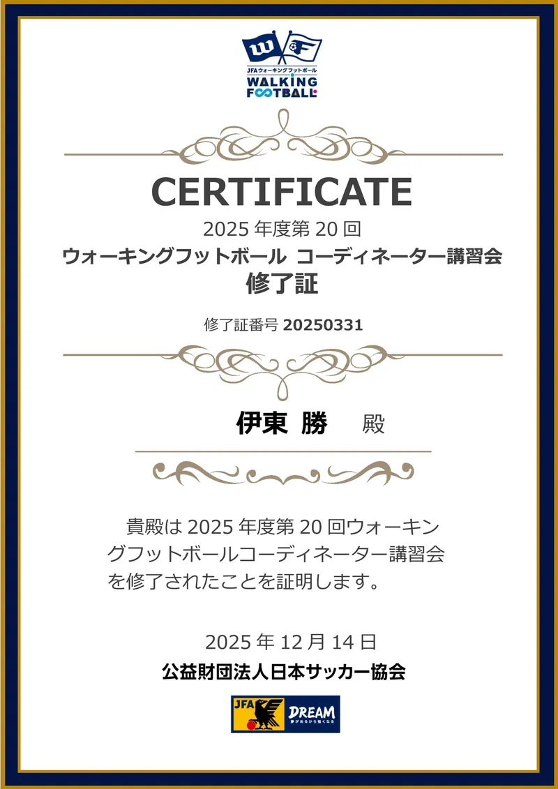 ○JWFL 日本ウォーキングフットボール連盟公認 ウォーキングフットボールコーディネーター